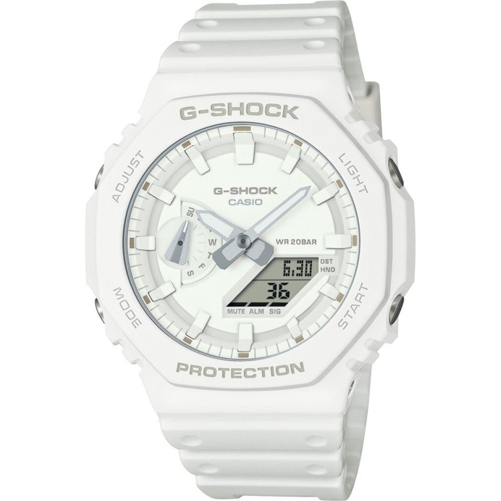 El GA-2100 luce su forma icónica en un estilo monocromático, disponible en tres colores: azul turquesa, blanco y amarillo voltio. La caja, el bisel e incluso los componentes de la esfera están acabados en tonos del mismo color sutilmente diferentes para aportarle un aspecto monocromático que cuenta con una profundidad y dimensión sorprendentes.