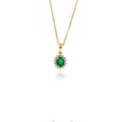 Collar con cadena fina en Oro 18K con colgante de esmeralda rodeada de circonitas blancas.