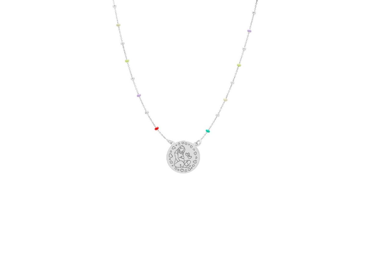 Collar de plata de ley 925 con cadena decorada con pequeñas bolas de colores intercaladas, aportando un toque alegre y moderno. El colgante en forma de chapa lleva grabada la silueta de una mujer embarazada acompañada de corazones, simbolizando amor, cuidado y la dulzura de la maternidad.