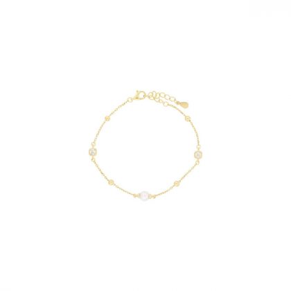 Pulsera de plata de ley 925 con baño de oro. Cadena de pequeñas bolas intercaladas, que aporta un toque delicado y moderno. En el centro, una perla blanca se combina con dos circonitas cuadradas a los lados, creando un equilibrio perfecto entre elegancia y brillo.
