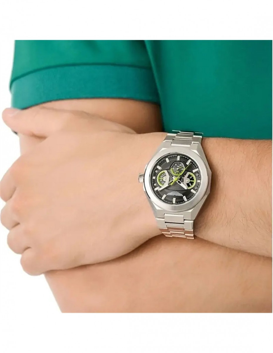 Este reloj de pila cuenta con caja y brazalete de acero reciclado con cierre desplegable. Sus detalles de caja robustos y resistentes refuerzan su perfil deportivo de manera destacada.