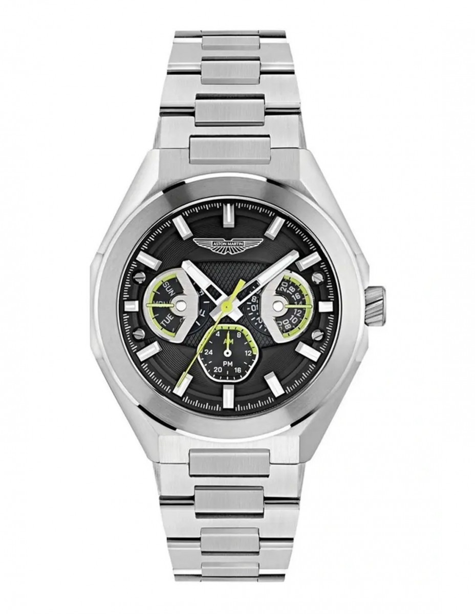 La esfera es de color negro con subesferas inspiradas en el tablero de Aston Martin. Además, incorpora detalles y agujas color Lime Essence y un fondo inspirado en el diseño de las rejillas (grille) de Aston Martin.