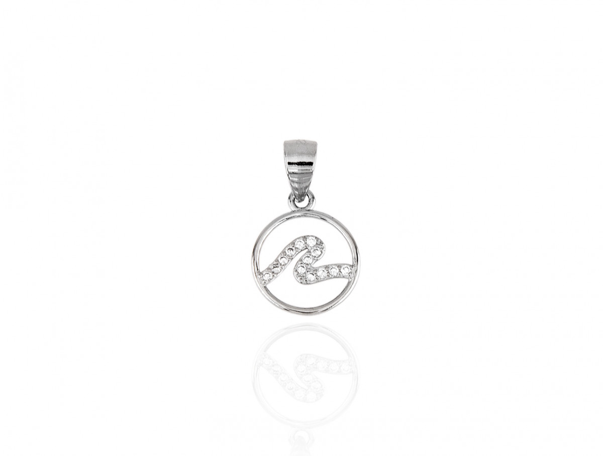 Colgante de plata en forma de círculo calado, con un diseño de ola formado por circonitas blancas que aportan brillo y movimiento al conjunto.