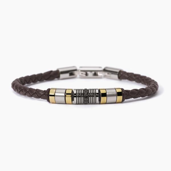 Pulsera de estilo masculino con diseño sofisticado y materiales de alta calidad. Fabricada en acero inoxidable 316L con detalles en PVD dorado, incorpora un elemento central de 7×30 mm con incrustaciones de cristales de Ø 1,5 mm que aportan un sutil brillo. La correa de lab leather marrón trenzada le da un aire natural y contemporáneo. Longitud ajustable de 19 a 20,5 cm para un ajuste cómodo y personalizado. Ideal para quienes buscan un accesorio elegante con un toque original.