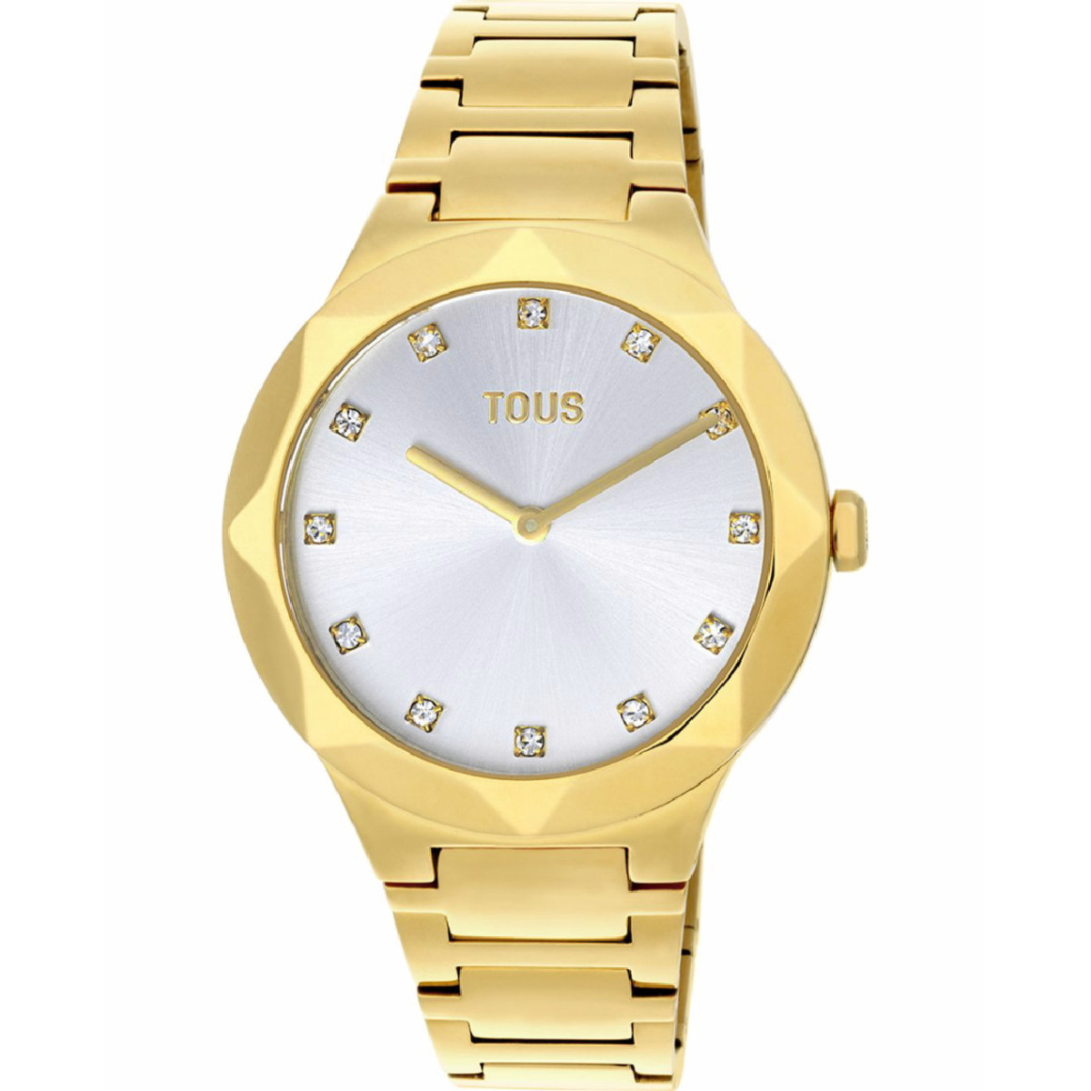 Reloj analógico TOUS Karat Round con brazalete de acero IPG dorado 316L, diámetro 36 mm y esfera de metal con cristales facetados en los índices. Funciones: hora y minutos. Impermeable a 5 ATM. Batería: 1,55V Oxido de plata SR621SW/0,3 gramos. Movimiento cuarzo japonés. Cierre desplegable con pulsadores.
