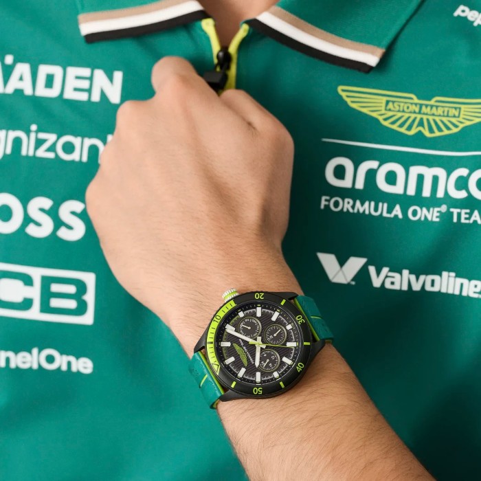 Reloj Aston Martin para hombre del equipo de Fórmula 1 fabricado en acero inoxidable negro y silicona verde. Estamos ante un reloj de diseño atractivo y deportivo compuesto por caja de 46mm de diámetro en color negro con detalles amarillos. Su esfera es negra con indicadores en forma de barras luminiscentes al igual que sus agujas movidas por mecanismo de cuarzo multifunción. Todo ello protegido por cristal mineral. Su brazalete es de silicona en color verde con detalles amarillos y cierre de hebilla. Resistente al agua hasta 10 ATM.