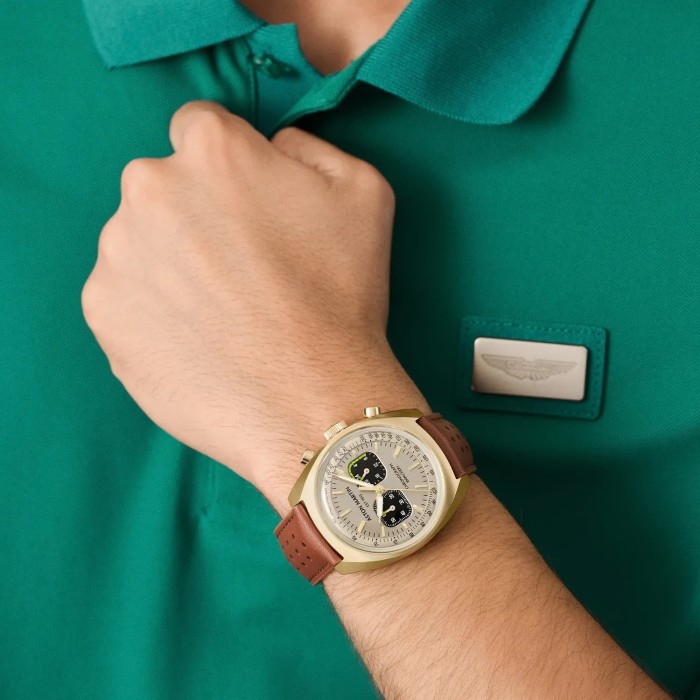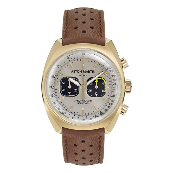 Reloj Aston Martin para hombre del equipo de Fórmula 1 colección Timeless fabricado en acero inoxidable dorado y piel marrón. Estamos ante un atractivo reloj compuesto por caja de 43mm de diámetro con bisel dorado al igual que su esfera que contiene indicadores en forma de barras negras y agujas luminiscentes movidas por mecanismo de cuarzo analógico con función de cronógrafo. Todo ello protegido por cristal mineral. Su brazalete es de piel perforada en color marrón con cierre de hebilla. Resistente al agua hasta 10 ATM.