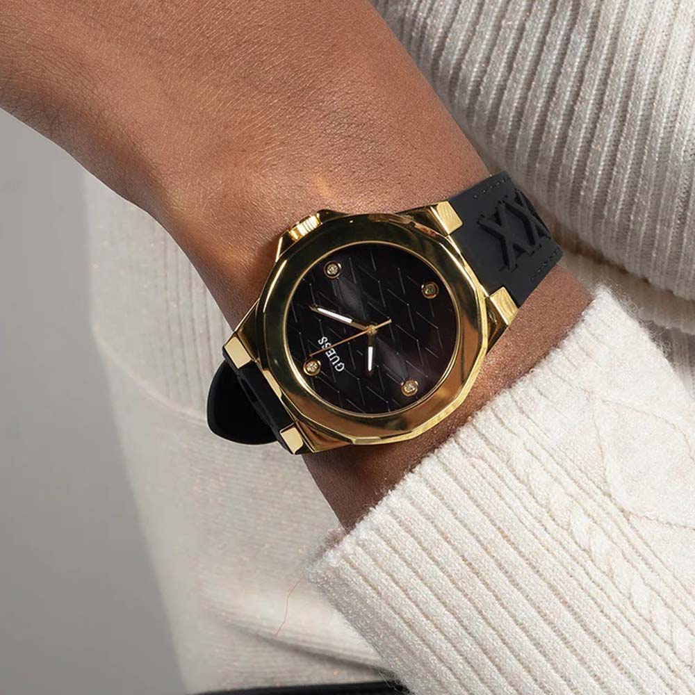 Reloj Guess GW0599L2. Caja del reloj de acero inoxidable IP dorado y correa de silicona negra, esfera negra con tres agujas y circonitas, impermeable 30M, cierre de hebilla. Incluye presentación de regalo con su caja oficial.