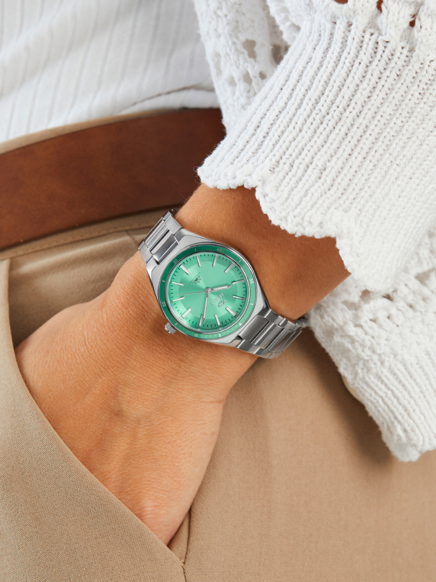 Material Caja: Metal con bisel color turquesa, con tapa trasera y corona de acero.