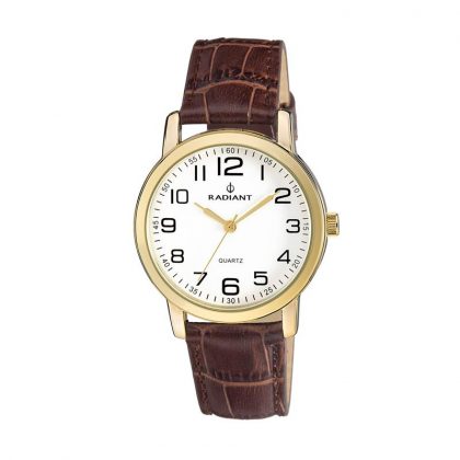 Reloj Radiant para hombre de la colección New Grand fabricado en acero inoxidable dorado y piel en color marrón. Estamos ante un reloj de diseño clásico lleno de elegancia compuesto por caja dorada de 40mm de diámetro con esfera blanca que contiene índices en color negro y agujas doradas movidas por mecanismo de cuarzo analógico protegido por cristal mineral. Su correa es de piel en color marrón con cierre de hebilla. Resistente al agua hasta 50 metros.