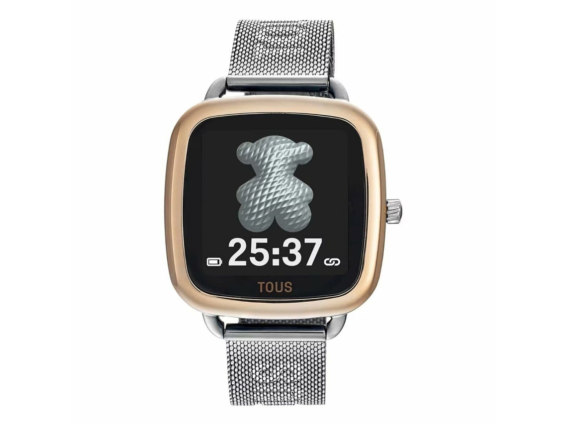 Reloj smartwatch TOUS D-Connect con brazalete de acero y caja en acero IPRG rosa. Dimensiones: 38,8 mm x 39,5 mm. Compatibilidad OS: Android 7.0 y iOS 12.0 o superior. Pantalla/LDC: táctil de 1,40 pulgadas TFT-DLC en color (Full Touch). Conectividad: Bluetooth versión BLE 5.0. Memoria RAM: 128 kb. Batería: 180 mAh, acumulador de batería 3.8V Litio/2,9 gr, recargable con cable magnético, 5-7 días en funcionamiento y 8-10 en reposo. Chipset: Realtek RTL8762CK y Frecuencia Cardíaca: HRS 3300. Impermeabilidad: IP68. Funciones: 8 Esferas TOUS + 4 intercambiables desde la TOUS WEAR APP, horas, minutos, mes, día, día de la semana, actividad diaria con contador de pasos, contador de calorías y distancia recorrida en millas o kilómetros, deportes (caminar, correr, cinta, escalada, elíptica, yoga, fitness, remo, HIIT, spinning, bicicleta, tenis, cricket y saltar la cuerda), frecuencia cardiaca, monitorización del sueño, presión arterial (aproximación), oxígeno en sangre (aproximación), función ovárica, notificaciones (llamadas, WhatsApp, email, SMS, Facebook, etc.), clima, cronógrafo 1/10 segundos, control música y control cámara. Cierre de malla milanesa con cierre de seguridad.