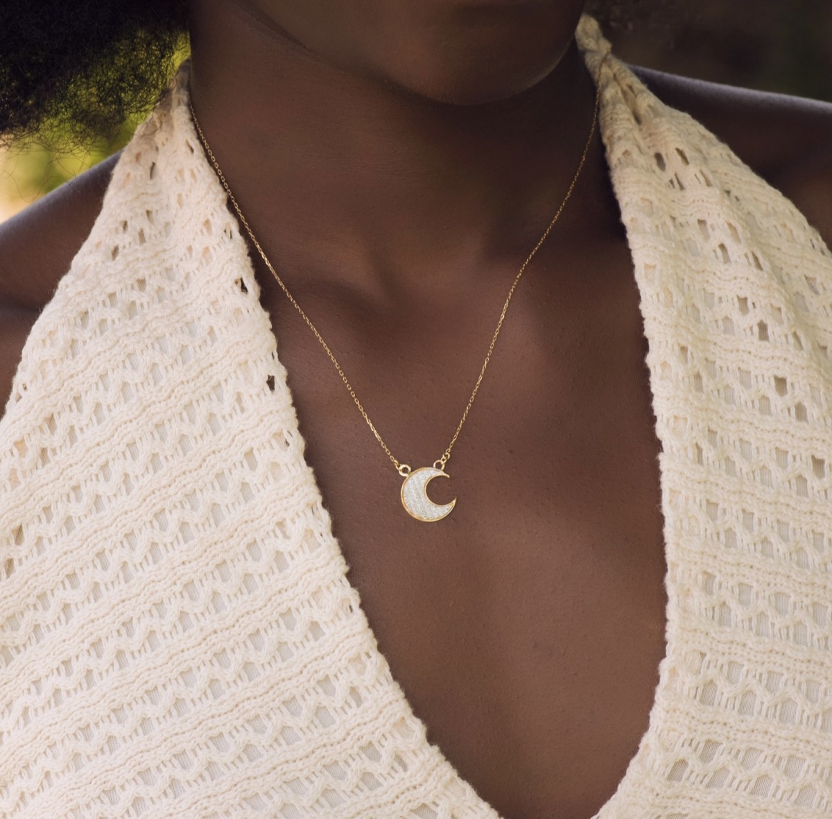 El protagonista es su colgante central en forma de media luna, elaborado en oro blanco con una textura suave que realza la luz y aporta profundidad a la pieza. Los bordes en oro amarillo enmarcan la media luna, creando un contraste armonioso y sofisticado entre ambos tonos de oro.