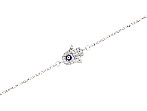 Pulsera en plata de 1ª ley de 925 milésimas, con un diseño fino de 1 mm de ancho que combina elegancia y simbolismo. El centro de 9 x 11 mm presenta una mano con un ojo turco azul, símbolo de protección y buena energía. Su acabado en plata rodiada aporta brillo duradero y resalta los detalles del diseño, convirtiéndola en una pieza única, moderna y significativa, ideal para llevar a diario.