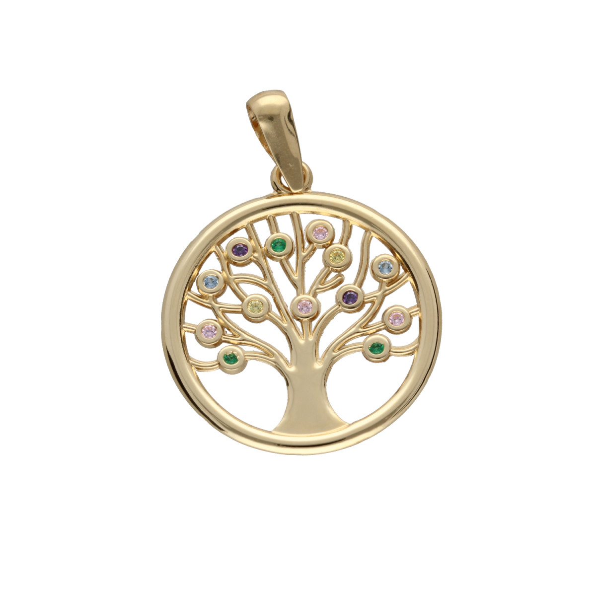 Colgante de árbol elaborado en oro de 9 quilates, decorado con circonitas de colores que aportan brillo y vitalidad. Su diseño simboliza la fuerza, el crecimiento y la conexión con la naturaleza, convirtiéndolo en una joya llena de significado. Ideal para llevar a diario o regalar como amuleto de energía y equilibrio.